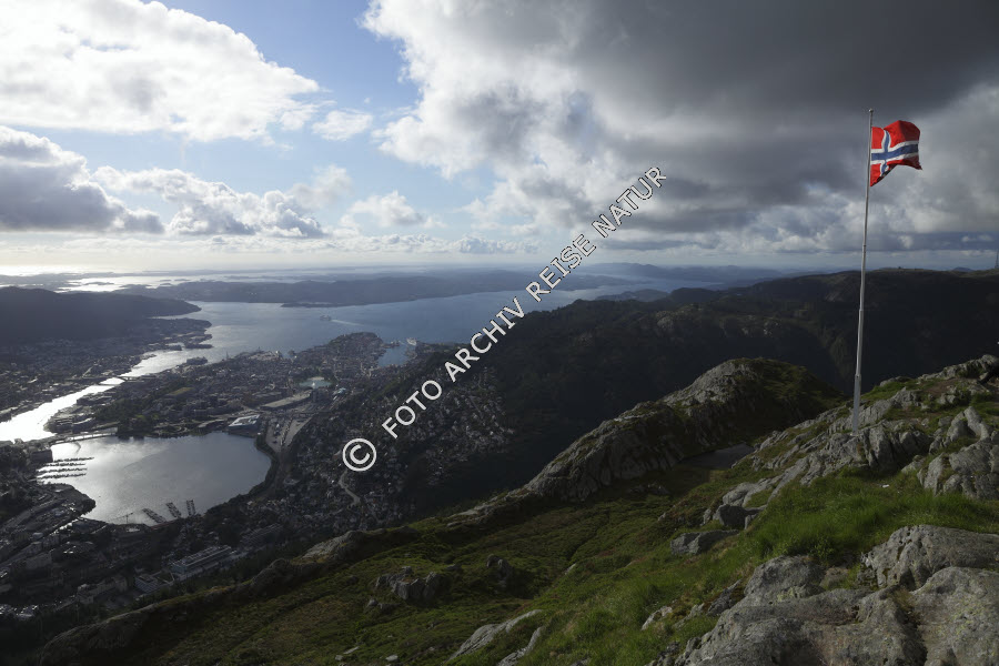 Bergen, Fahne, Felsblock, Felsen, Felsrücken, Fjord, Flagge, Gegenstand, Gewässer, Hordaland, Insel, Kulturlandschaft, Landschaft, Material, Meer, Nordmeer, Norwegen, Schäre, Schärengarten, Stadt, Stadtansicht, Stein, Ulriken,