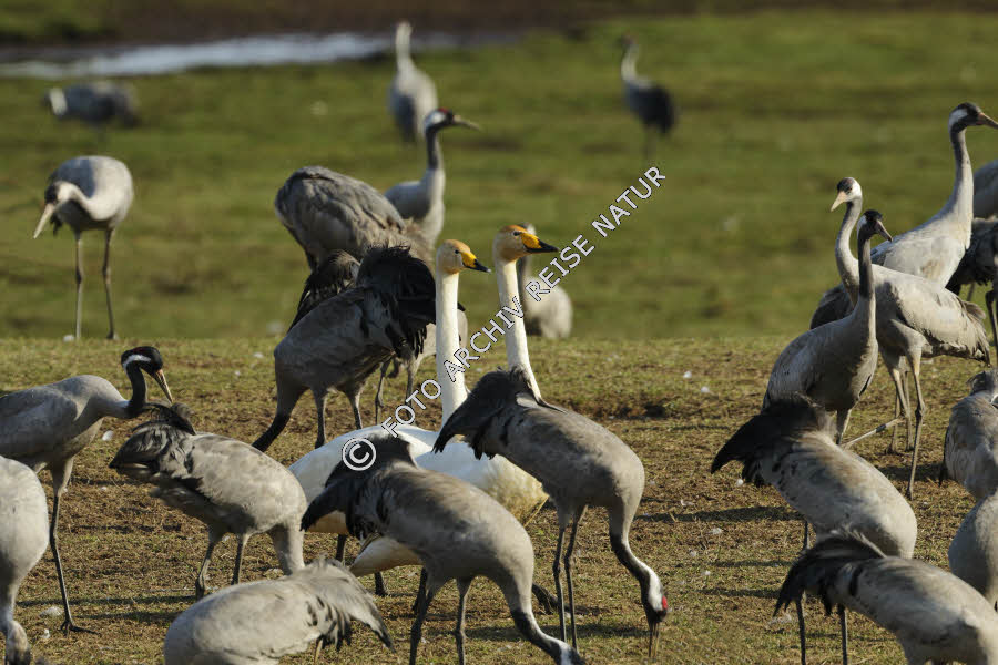 Singschwäne zwischen rastende Kraniche am Hornborgasjön
