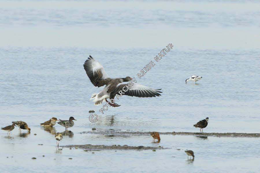 Bewegen, Deutschland, Entenvögel, Ereignis, Fauna, Fliegen, Gefieder, Geschehen, Graugans, Anser anser, Grüner Brink, Insel Fehmarn, Kampfläufer, Philomachus pugnax, Landung, Mauser, Naturschutzgebiet, Ort, Schleswig-Holstein, Schnepfenvogel, Tätigkeit, Vogel, Watvogel,