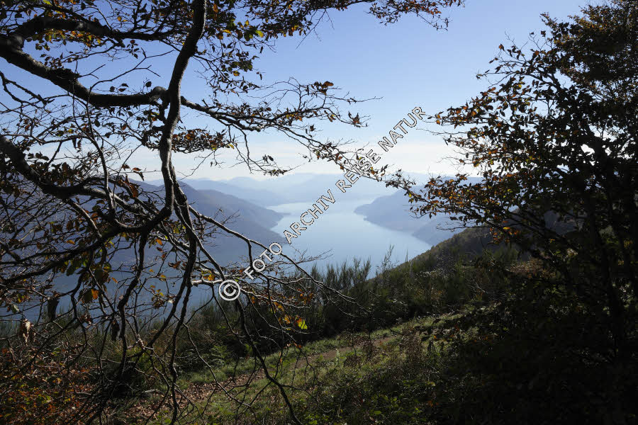 Baum, Berg, Berghang, Bergkette, Buche, Fagus, Buchengewächs, Buchenwald, Farbe, Flora, Gebirge, Gewässer, Lago Maggiore, Landschaft, Laubwald, See, Wald, Wiese, Wiesenhang, bunt,