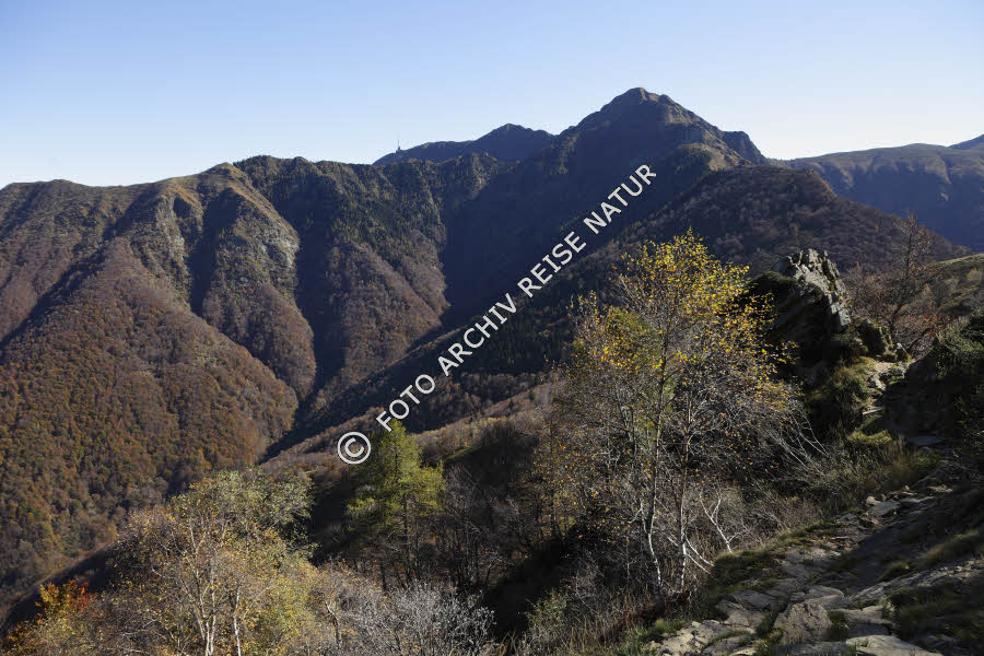 Bauwerk, Berg, Berghang, Bergkette, Bergpfad, Bergwald, Birkenwald, Farbe, Gebirge, Gipfel, Landschaft, Laubwald, Pfad, Tamaro, Verkehrsweg, Wald, Wanderweg, Weg, bunt,