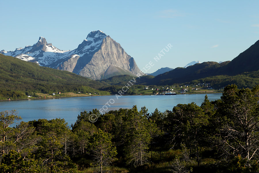 Arhaugfjorden, Berg, Blokktinden, Fjord, Furøy, Gewässer, Landschaft, Meløy, Nordland, Norwegen,