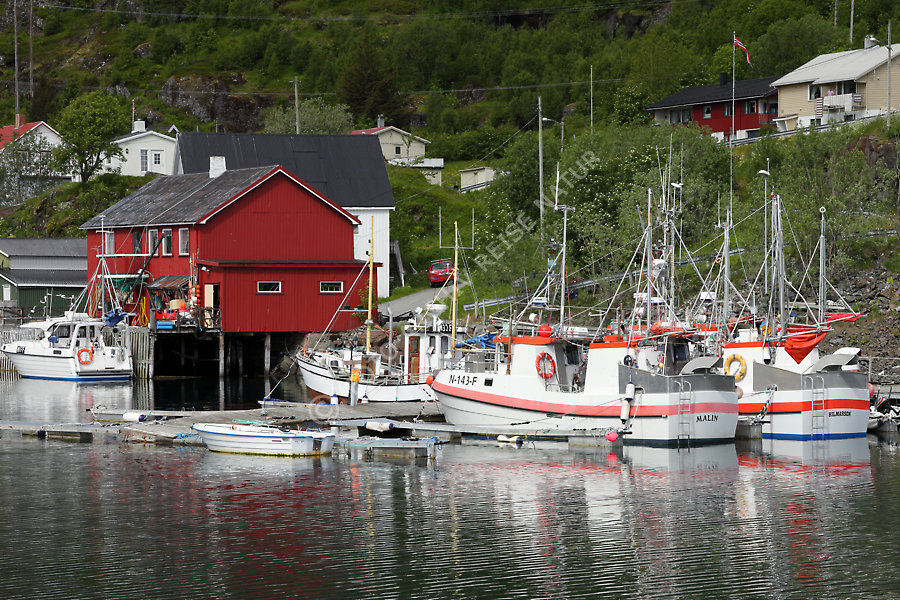Bauwerk, Boot, Bootssteg, Fahrzeug, Fischerboot, Fischereihafen, Fischkutter, Flakstadøy, Hafen, Lofoten, Napp, Nordland, Norwegen, Pfahlbau, Steg, Verkehrsmittel, Wasserfahrzeug,