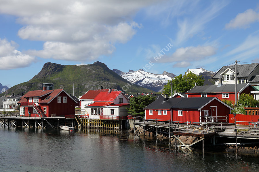 Austvågøya, Bauwerk, Farbe, Haufenwolke, Cumulus, Lofoten, Nordland, Norwegen, Pfahlbau, Svolvær, Wetter, Klima, Wolke, rot, weiß,