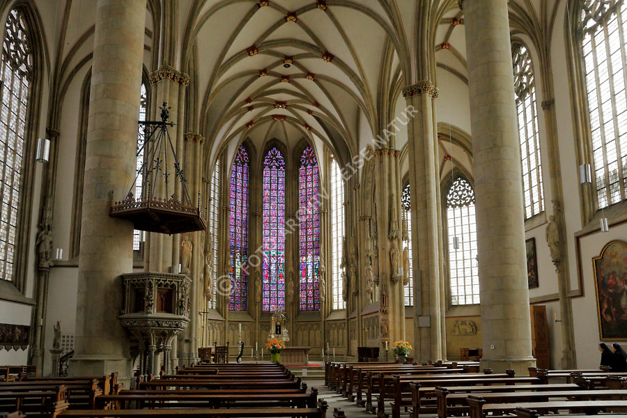 Keywords: Baustil, Bauwerk, Deutschland, Fassade, Gebäudeteil, Gewölbe, Gewölbebogen, Gotik, Kapitell, Kirchenfassade, Kreuzgewölbe, Münster, Netzgewölbe, Nordrhein-Westfalen, Säule,