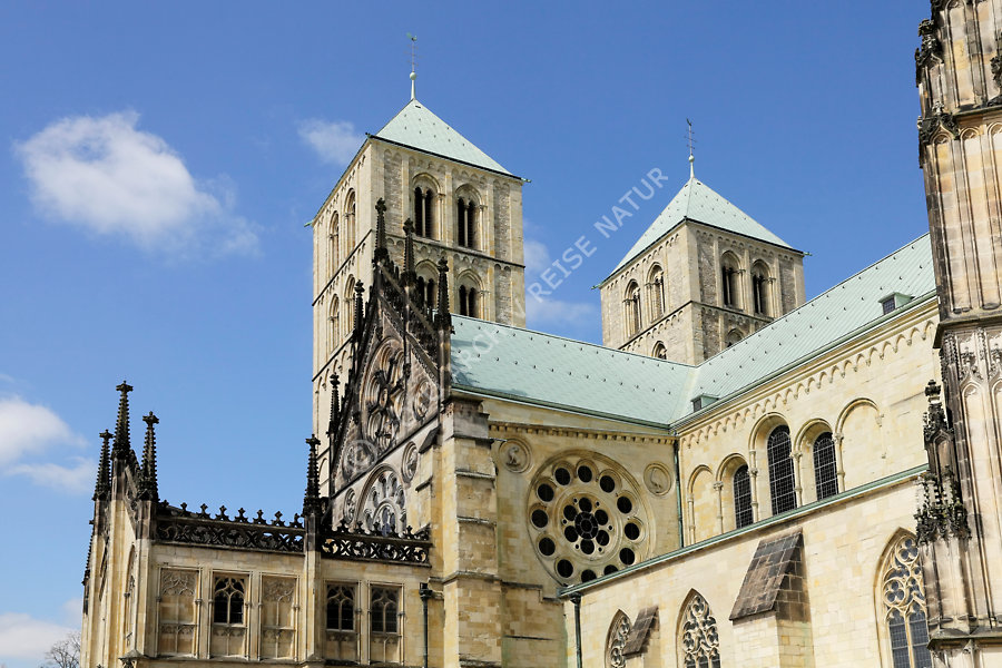 Baustil, Bauwerk, Bleiglasfenster, Deutschland, Dom, Fenster, Fensterrose, Gebäude, Gebäudeteil, Gotik, Kathedrale, Kirche, Kirchturm, Münster, Nordrhein-Westfalen, Rosette, Sakralbau, Spätgotik, Turm,
