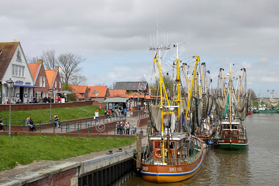 Greetsieler Fischereihafen mit Giebelfront der alten Fischerhäuser