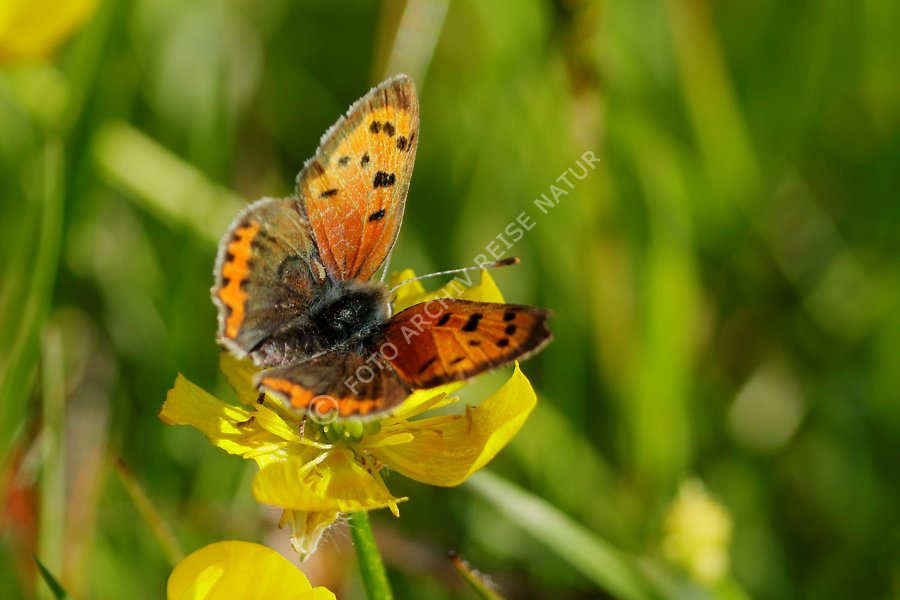 Acker-Hahnenfuß, Ranunculus arvensis, Blekinge, Fauna, Flora, Hahnenfußgewächs, Insekt, Kleiner Feuerfalter, Lycaena phlaeas, Korsanäs, Schmetterling, Schweden,