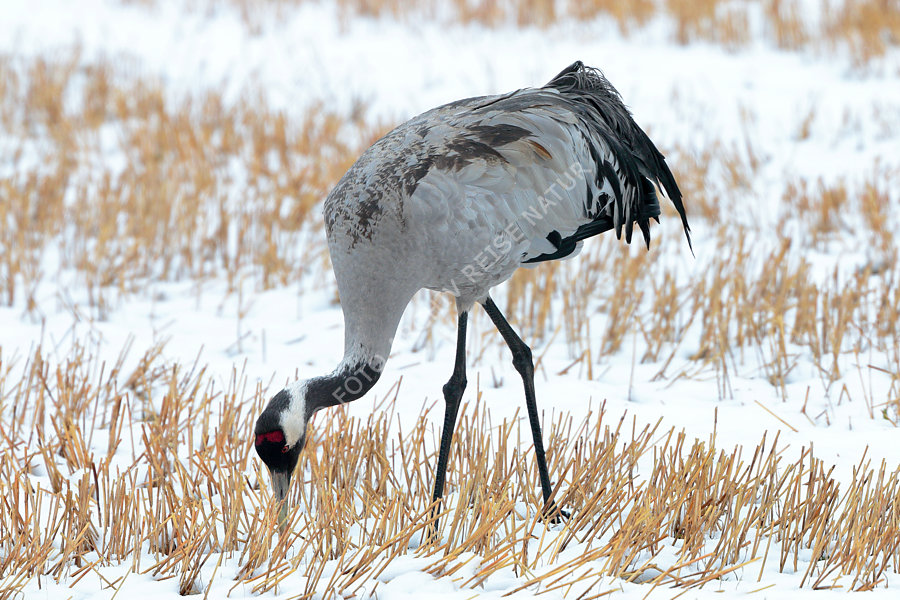 Kranich beim Zug ins Brutgebiet vom Neuschnee überrascht