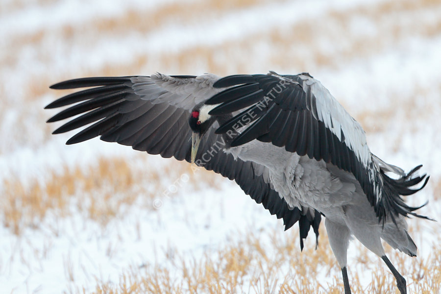 Kranich beim Zug ins Brutgebiet vom Neuschnee überrascht