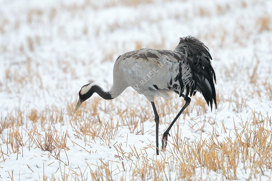 Kranich beim Zug ins Brutgebiet vom Neuschnee überrascht