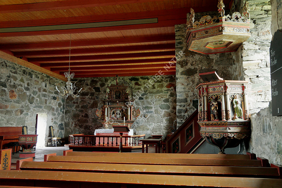 Altar, Bauwerk, Chor- Altarraum, Frosta, Gebäude, Gebäudeteil, Kanzel, Kirche, Kirchenkanzel, Kirchenschiff, Kultur, Kulturdenkmal, Kulturstätte, Logtun, Natursteinkirche, Nord-Trøndelag, Norwegen, Ort, Sakralbau, Steinkirche, historisch,