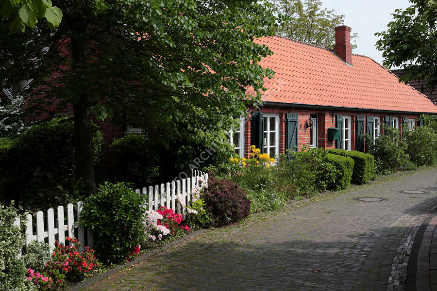 Bauwerk, Blume, Blumenrabatte, Blumenschmuck, Deutschland, Dorf, Dorfstraße, Flora, Krummhörn, Kulturlandschaft, Niedersachsen, Ostfriesland, Rysum, Straße, Verkehrsweg,