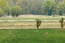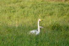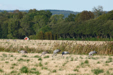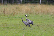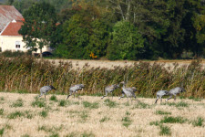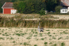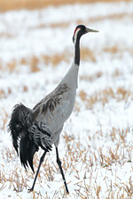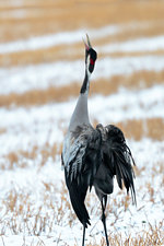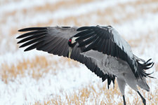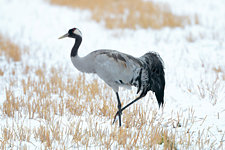 Kranich beim Zug ins Brutgebiet vom Neuschnee überrascht