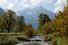 Herbstliches Alpenvorland bei Brunnen, Blick auf die Allgäuer Alpen mit Alpspitz