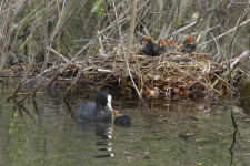 Blässhuhn füttert Küken am Nest