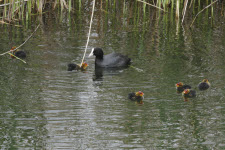 Blässhuhn mit sechs Küken
