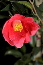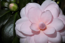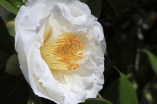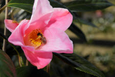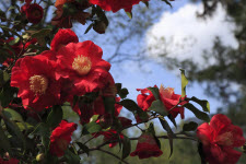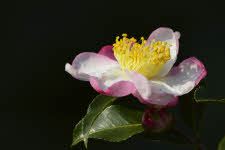 Zitronenfalter auf Kamelienblüte mit Staubgefäße