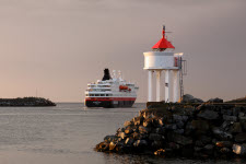 Die Nordkapp der Hurtigruten in der Hafenausfahrt von Berlevåg
